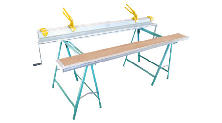 Planche à border 2 M référence PB2040, en bois exotique imputrescible bordée de cornières en acier zingué sur 3 cotés. S'utilise avec la plieuse boudineuse PAL2040 et la paire de tréteaux métalliques TRET-METAL